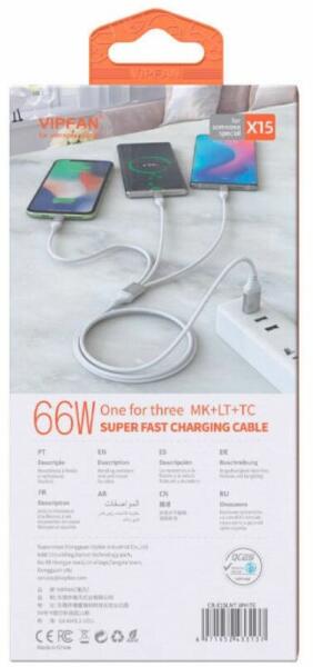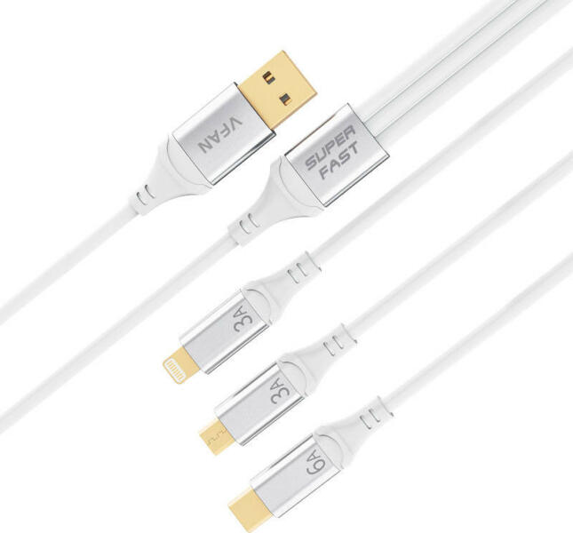 Cablu USB Vipfan X15 3-in-1 USB-C / Lightning / Micro 66W 1,2m, placat cu aur (alb). Incarcati rapid si convenabil pana la 3 dispozitive simultan! Cablul USB 3-in-1 Vipfan X15 are 3 conectori - USB-C / Lightning / Micro. Garanteaza incarcare rapida cu o putere de 66W. Pe langa toate acestea, este extrem de durabil si sigur pentru utilizatori. Incarcare rapida Nu-ti pierde nervii asteptand ca toate dispozitivele sa se incarce! Cablul USB 3-in-1 Vipfan X15 permite incarcarea cu o putere de 66 de wati. Accepta marci precum; Juawei, OPPO, VIVO si Xiaomi. In plus, aceasta solutie este complet sigura pentru utilizatori. Incarcati pana la 3 dispozitive simultan Acum nu mai trebuie sa asteptati ca un dispozitiv sa se incarce pentru a conecta altul! Cei 3 conectori disponibili (USB-C / Lightning / Micro) va permit sa alimentati 3 dispozitive in acelasi timp. Opteaza pentru comoditate cu Vipfan X15 3-in-1! Design exceptional Apreciaza confortul exceptional de utilizare. Lungimea cablului este de 1,2 m, ceea ce nu va limiteaza si va permite sa va folositi echipamentul in timpul incarcarii. Cablul USB Vipfan X15 3in1 te va servi mult timp. Fiind confectionat din sarma de cupru asigura siguranta si durabilitate. Cablul este, de asemenea, incredibil de flexibil si rezistent la indoire. Specificatie: Marca Vipfan Model X15 Culoare alb Material TPE + aliaj de aluminiu Interfata USB-C / Lightning / Micro Iesire 66 W. Lungime 1,2 m